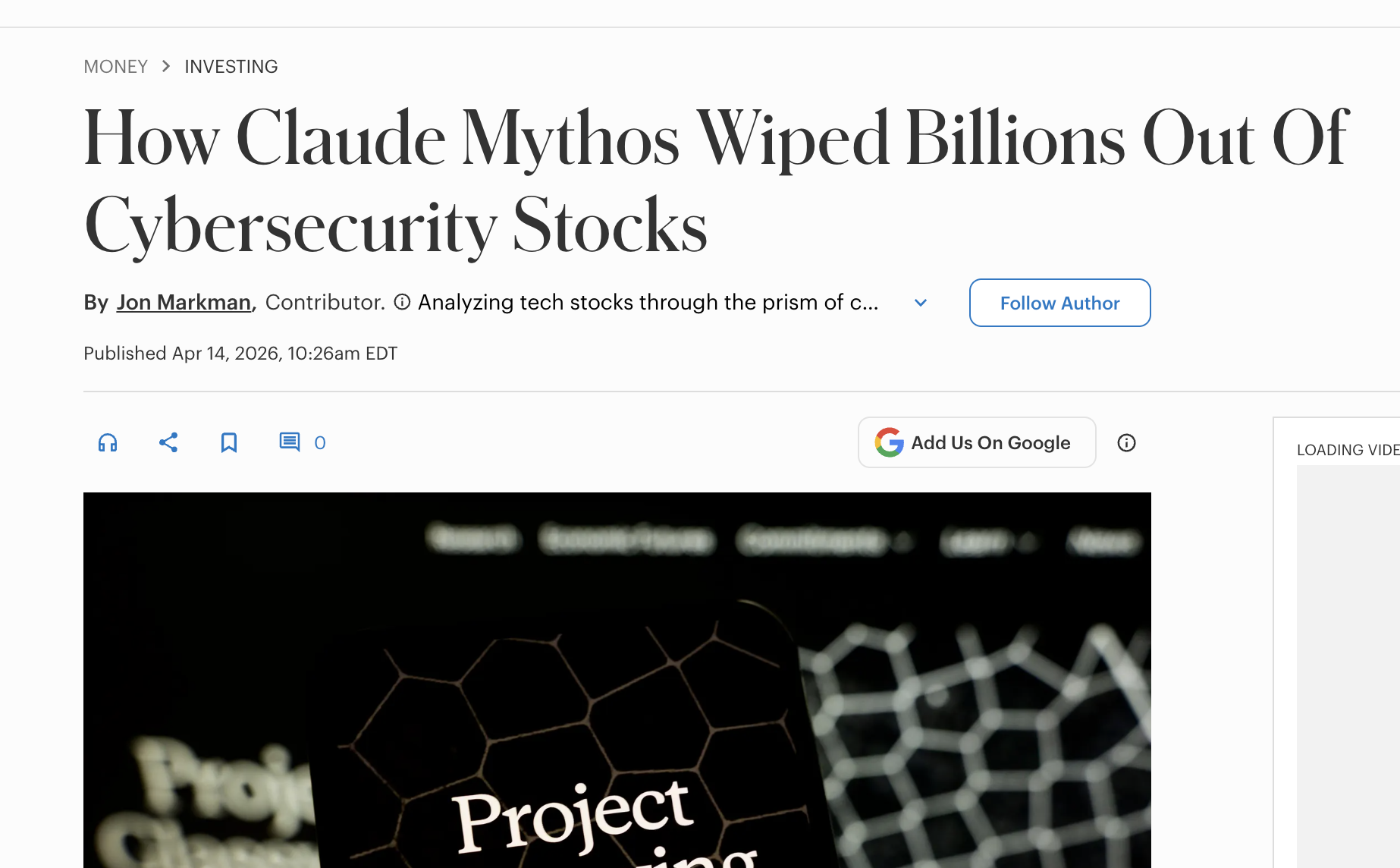As per Forbes article, Claude Mythos Wiped Billions Out Of Cybersecurity Stocks