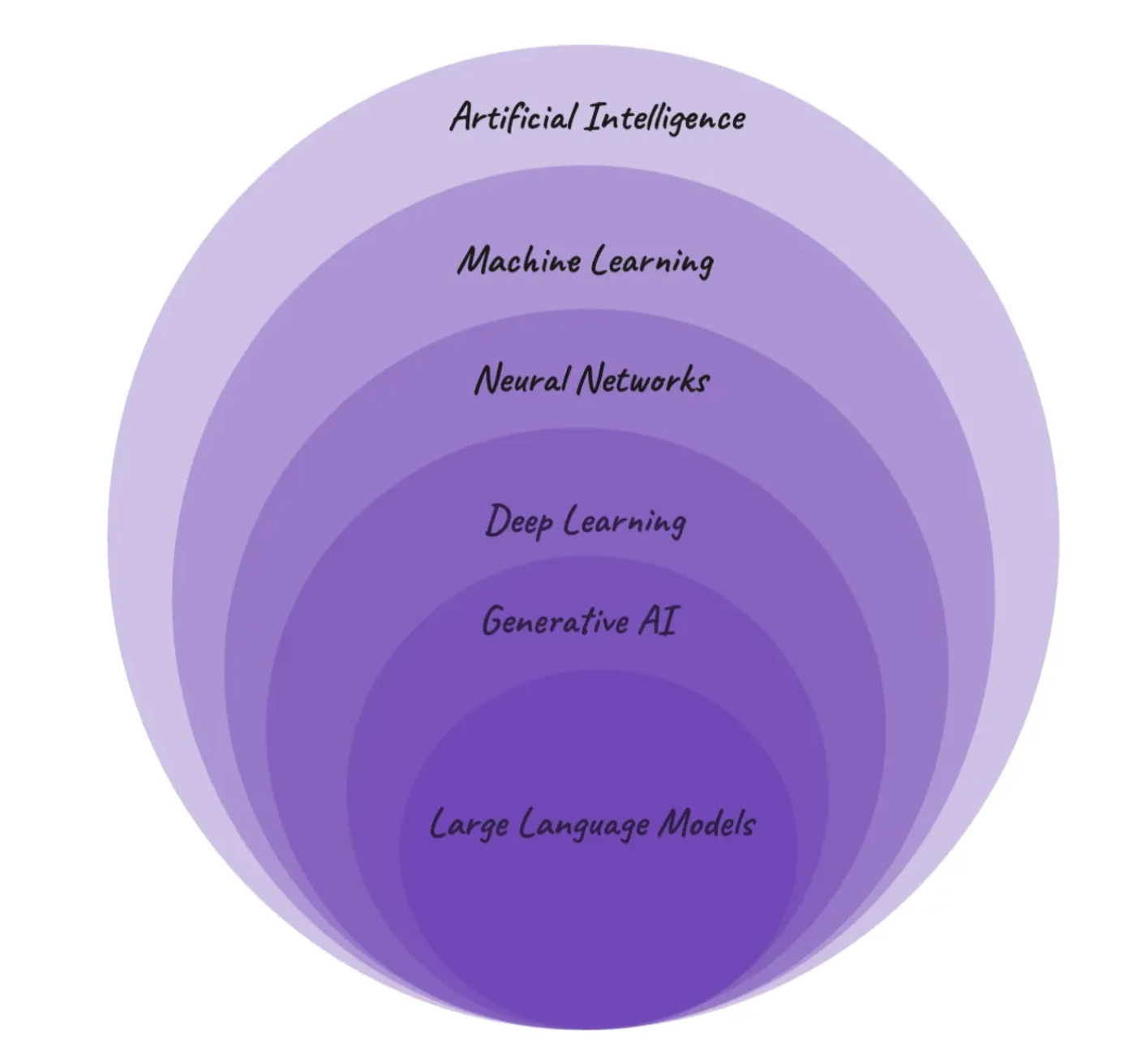 Let’s re-arrange the concepts: AI, Machine Learning (ML), Neural Networks (NNs), Deep Learning (DL), Generative AI (GenAI), and Large Language Models (LLMs).