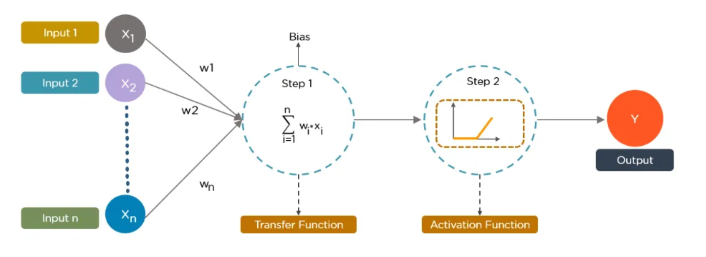 - Transfer Function: The node calculates the weighted sum of the inputs and the bias using the formula: