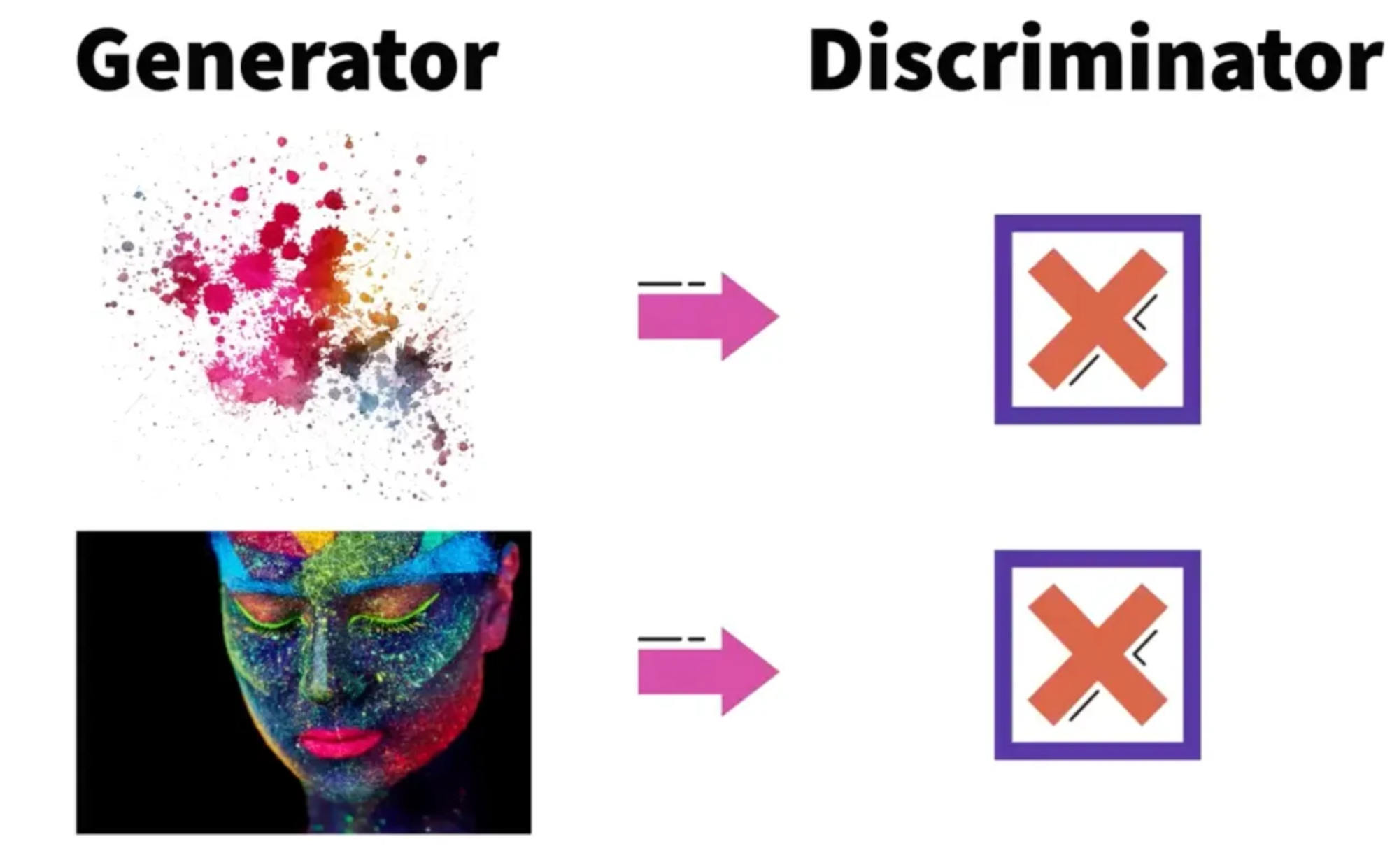 - The Generator creates images. At first, its attempts are awful — like randomly splashing paint on a wall.